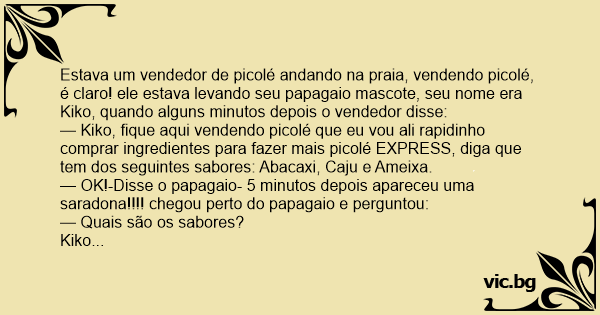 Estava um vendedor de picolé andando na praia, vendendo picolé, é claro! ele estava levando seu papagaio mascote, seu nome era Kiko, quando alguns minutos depois o vendedor disse: