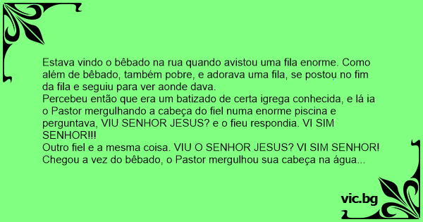 Chegou a vez do bêbado, o Pastor mergulhou sua cabeça na água da piscina, e perguntou. VIU O SENHOR JESUS? e o bêbado NÃO VI NÃO SENHOR.