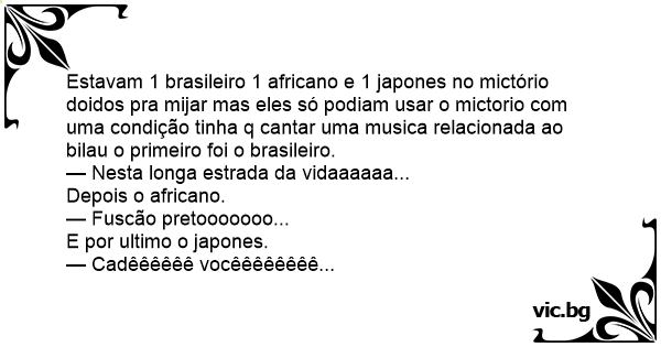 Estavam 1 brasileiro 1 africano e 1 japones no mictório doidos pra mijar mas eles só podiam usar o mictorio com uma condição tinha q cantar uma musica relacionada ao bilau o primeiro foi o brasileiro.