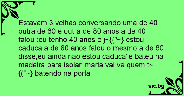 Estavam 3 velhas conversando uma de 40 outra de 60 e outra de 80 anos a de 40 falou :eu tenho 40 anos e j~{("~} estou caduca a de 60 anos falou o mesmo a de 80 disse;eu ainda nao estou caduca"e bateu na madeira para isolar' maria vai ve quem t~{("~} batendo na porta