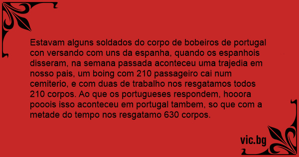 Estavam alguns soldados do corpo de bobeiros de portugal соn versando com uns da espanha, quando os espanhois disseram, na semana passada aconteceu uma trajedia em nosso pais, um boing com 210 passageiro cai num cemiterio, e com duas de trabalho nos resgatamos todos 210 corpos. Ao que os portugueses respondem, hooora pooois isso aconteceu em portugal tambem, so que com a metade do tempo nos resgatamo 630 corpos.