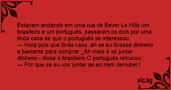 Estavam andando em uma rua de Bever Le Hills um brasileiro e um português, passaram os dois por uma linda casa de que o português se interessou: