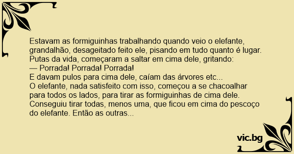 Estavam as formiguinhas trabalhando quando veio o elefante, grandalhão, desageitado feito ele, pisando em tudo quanto é lugar.