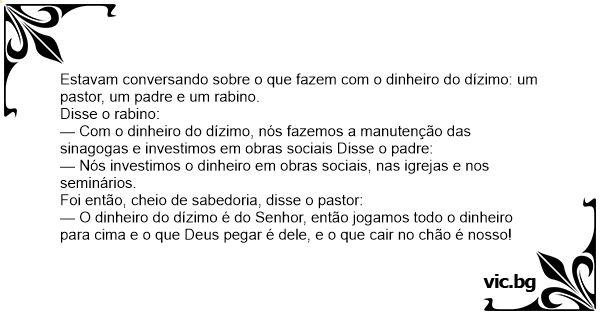 Estavam conversando sobre o que fazem com o dinheiro do dízimo: um pastor, um padre e um rabino.