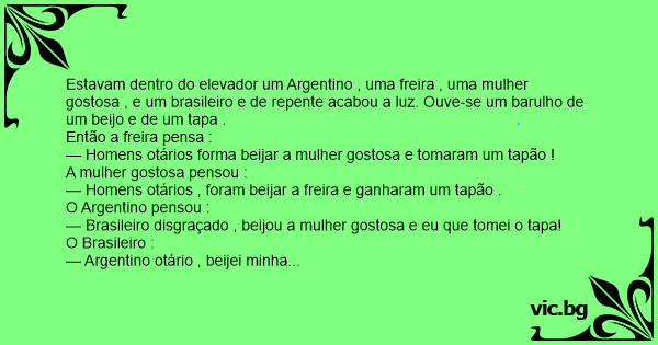 Estavam dentro do elevador um Argentino , uma freira , uma mulher gostosa , e um brasileiro e de repente acabou a luz. Ouve-se um barulho de um beijo e de um tapa .