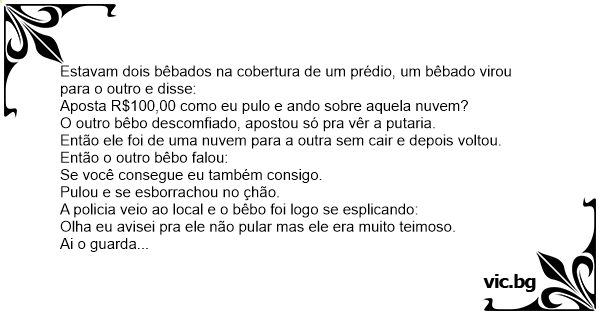 Estavam dois bêbados na cobertura de um prédio, um bêbado virou para o outro e disse: