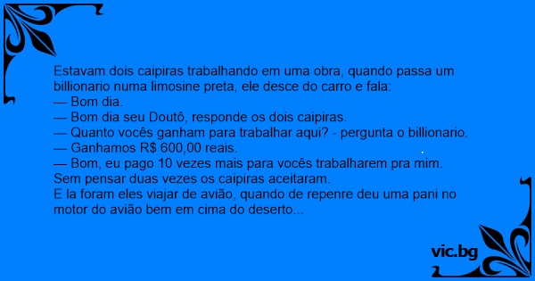 Estavam dois caipiras trabalhando em uma obra, quando passa um billionario numa limosine preta, ele desce do carro e fala: