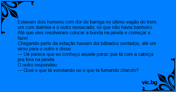 Estavam dois homens com dor de barriga no último vagão do trem, um com diarréia e o outro ressecado; só que não havia banheiro.