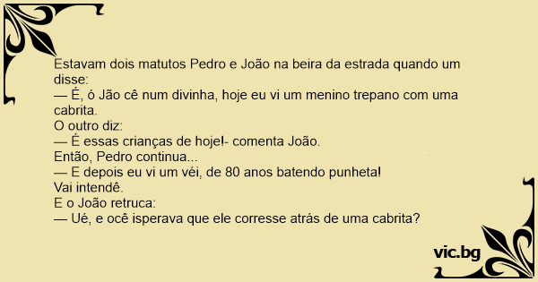 — É, ó Jão cê num divinha, hoje eu vi um menino trepano com uma cabrita.
