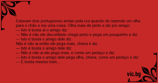 Estavam dois portugueses andan pela rua quando de repende um olha para o chão e me uma coisa. Olha mais de perto e diz pro amigo: