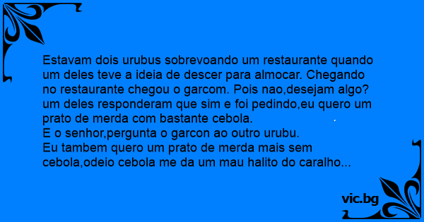 Estavam dois urubus sobrevoando um restaurante quando um deles teve a ideia de descer para almocar. Chegando no restaurante chegou o garcom. Pois nao,desejam algo?um deles responderam que sim e foi pedindo,eu quero um prato de меrdа com bastante cebola.