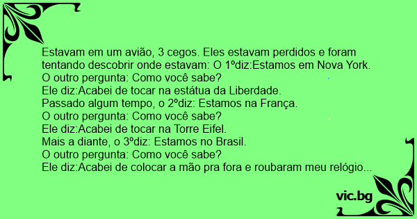 Estavam em um avião, 3 cegos. Eles estavam perdidos e foram tentando descobrir onde estavam: O 1ºdiz:Estamos em Nova York.