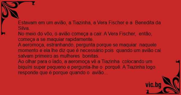 Ao olhar para o lado, a aeromoça vê a Tiazinha colocando um biquíni super pequeno e pergunta-lhe o porquê. A Tiazinha logo responde que é porque quando o avião cai, procuram primeiro as gostosas.