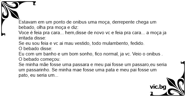 Se sua mae fosse uma vаса e seu pai fosse uma anta... O bebado interrompeu e disse - seria o cobrador, continuou falando besteira ... todos deste lado do onibus sao gаys e todos do outro sao traveco... o pessoal caiu na borrado com o bebado, ele desceu do onibus, ia descendo a ladeira vinha subindo uma freira o bebado olhou, deu-lhe um soco na freira e disse, esperava mais de vc hem batiman..