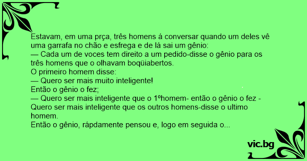 Estavam, em uma prça, três homens á conversar quando um deles vê uma garrafa no chão e esfrega e de lá sai um gênio: