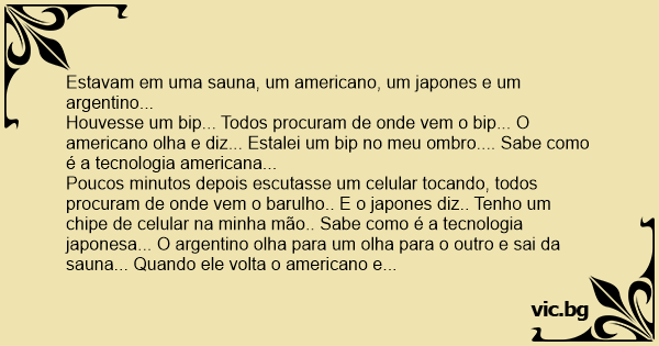 Poucos minutos depois escutasse um celular tocando, todos procuram de onde vem o barulho.. E o japones diz.. Tenho um chipe de celular na minha mão.. Sabe como é a tecnologia japonesa... O argentino olha para um olha para o outro e sai da sauna... Quando ele volta o americano e o japones perguntam o que ele esta fazendo com um papel higienico enfiado no cú... Ele disse que nao era um papel higienico, mas sim que estava recebendo um fax, sabe como é a tecnologia argentina...