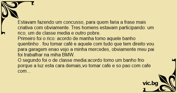Estavam fazendo um concusso, para quem faria a frase mais criativa com obviamente. Tres homens estavam participando: um rico, um de classe media e outro pobre.