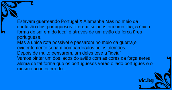Estavam guerreando Portugal X Alemanha Mas no meio da confusão dois portugueses ficaram isolados em uma ilha, a única forma de sairem do local é através de um avião da força ãrea portuguesa.