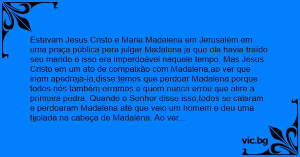 Estavam Jesus Cristo e Maria Madalena em Jerusalém em uma praça pública para julgar Madalena ja que ela havia traído seu marido e isso era imperdoável naquele tempo. Mas Jesus Cristo em um ato de compaixão com Madalena,ao ver que iriam apedrejá-la,disse:temos que perdoar Madalena porque todos nós também erramos e quem nunca errou que atire a primeira pedra. Quando o Senhor disse isso,todos se calaram e perdoaram Madalena até que veio um homem e deu uma tijolada na cabeça de Madalena. Ao ver aquilo o Senhor surpreso perguntou para o homem:meu filho,você nunca errou?E o homem respondeuessa distância não!