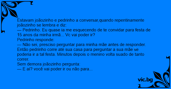 — Pedrinho. Eu quase ia me esquecendo de te convidar para festa de 15 anos da minha irmã... Vc vai poder ir?