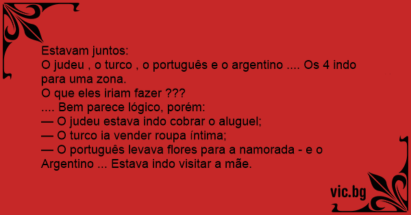 O judeu , o turco , o português e o argentino .... Os 4 indo para uma zona.