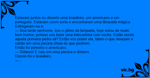 Estavam juntos no deserto uma brasileiro, um americano e um português. Estavam conm sorte e encontraram uma lâmpada mágica. Esfregaram-na e: