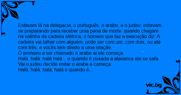 Estavam lá na delegacia, o português, o arabe, e o judeu. estavam se preparando para receber uma pena de morte: quando chegam na salinha de cadeira elétrica, o homem que faz a execução diz: A cadeira vai falhar com alguém, pode ser com um, com dois, ou até com três, e vocês tem direito a uma oração.