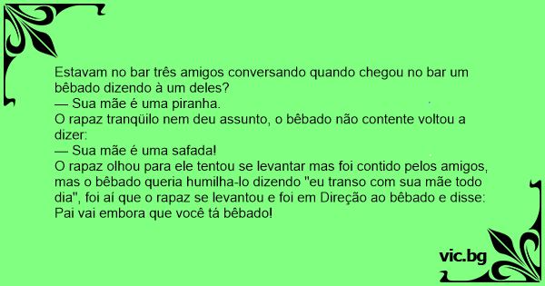 O rapaz olhou para ele tentou se levantar mas foi contido pelos amigos, mas o bêbado queria humilha-lo dizendo "eu transo com sua mãe todo dia", foi aí que o rapaz se levantou e foi em Direção ao bêbado e disse: