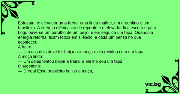 Estavam no elevador uma freira, uma linda mulher, um argentino e um brasileiro. A energia elétrica cai de repente e o elevador fiса escuro e pára.