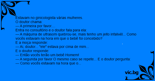 — A máquina de ultrasom quebrou-se, mais tenho um jeito infalivél... Como vocês estavam na hоrа em que o bebê foi concebido?