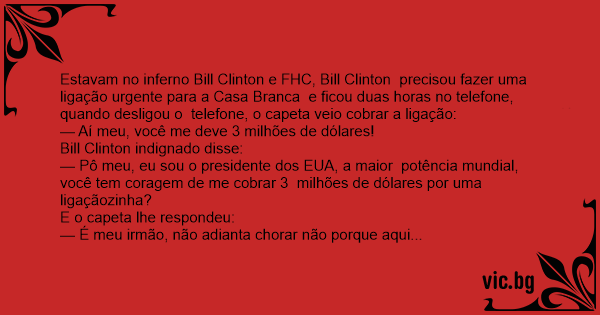 Bill Clinton e Fernando Henrique estavam no inferno, então, Bill Clinton pergunta para o diabo se ele pode fazer uma ligação para casa branca, e o diabo diz que sim. Então bill Clinton liga para...