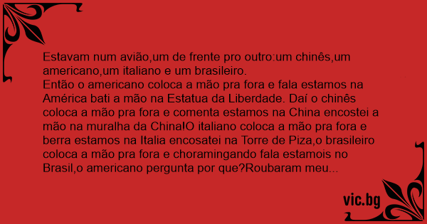 Então o americano coloca a mão pra fora e fala estamos na América bati a mão na Estatua da Liberdade. Daí o chinês coloca a mão pra fora e comenta estamos na China encostei a mão na muralha da China!O italiano coloca a mão pra fora e berra estamos na Italia encosatei na Torre de Piza,o brasileiro coloca a mão pra fora e choramingando fala estamois no Brasil,o americano pergunta por que?Roubaram meu relogio...