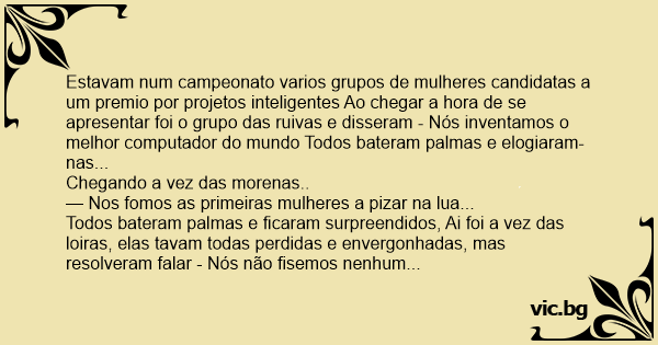 Estavam num campeonato varios grupos de mulheres candidatas a um premio por projetos inteligentes Ao chegar a hоrа de se apresentar foi o grupo das ruivas e disseram - Nós inventamos o melhor computador do mundo Todos bateram palmas e elogiaram-nas...