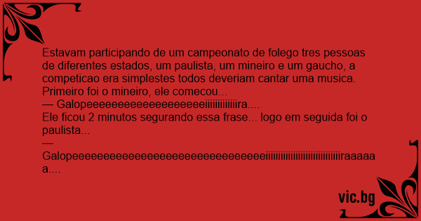 Estavam participando de um campeonato de folego tres pessoas de diferentes estados, um paulista, um mineiro e um gaucho, a competicao era simplestes todos deveriam cantar uma musica.