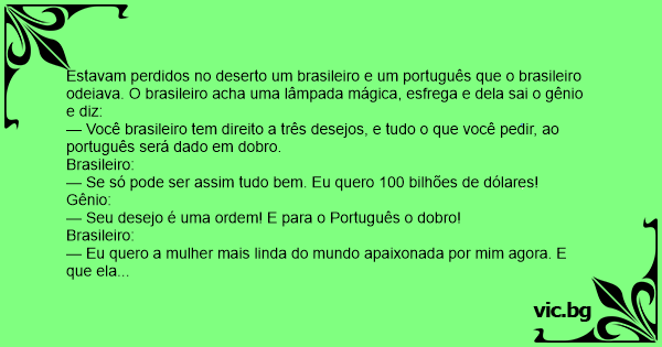 Estavam perdidos no deserto um brasileiro e um português que o brasileiro odeiava. O brasileiro acha uma lâmpada mágica, esfrega e dela sai o gênio e diz: