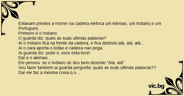 Estavam prestes a morrer na cadeira eletrica um Alemao, um Indiano,e um Portugues...