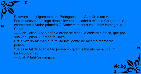 Estavam sob julgamento um Português , um Alemão e um Árabe... Foram acusados e logo depois levados a cadeira elétrica Chegando lá, chamaram o Árabe primeiro O Árabe com seus costumes começou a Rezar: