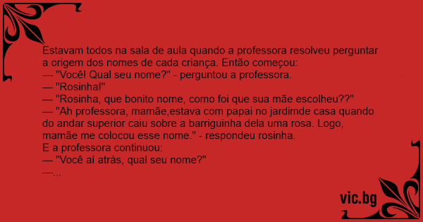 — "Ah professora, mamãe,estava com papai no jardimde casa quando do andar superior caiu sobre a barriguinha dela uma rosa. Logo, mamãe me colocou esse nome." - respondeu rosinha.