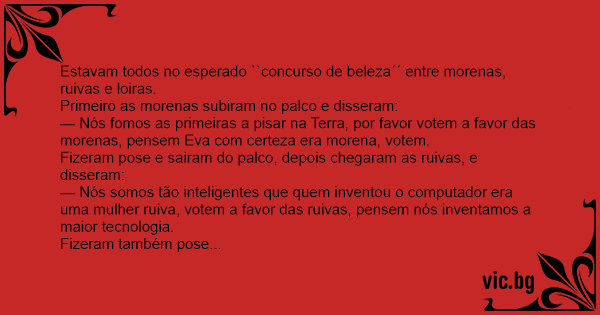 — Nós somos tão inteligentes que quem inventou o computador era uma mulher ruiva, votem a favor das ruivas, pensem nós inventamos a maior tecnologia.