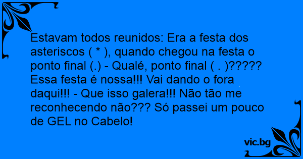 Estavam todos reunidos: Era a festa dos asteriscos ( * ), quando chegou na festa o ponto final (.) - Qualé, ponto final ( . )????? Essa festa é nossa!!! Vai dando o fora daqui!!! - Que isso galera!!! Não tão me reconhecendo não??? Só passei um pouco de GEL no Cabelo!