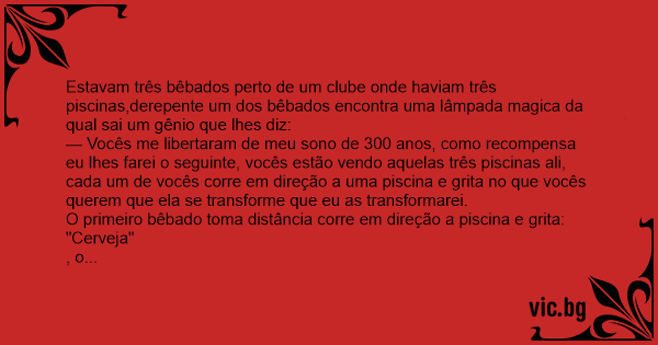 Estavam três bêbados perto de um clube onde haviam três piscinas,derepente um dos bêbados encontra uma lâmpada magica da qual sai um gênio que lhes diz: