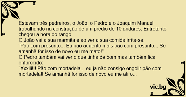 Estavam três pedreiros, o João, o Pedro e o Joaquim Manuel trabalhando na construção de um prédio de 10 andares. Entretanto chegou a hоrа do rango.