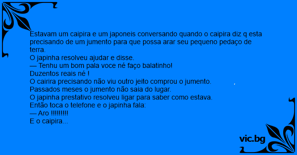 Estavam um caipira e um japoneis conversando quando o caipira diz q esta precisando de um jumento para que possa arar seu pequeno pedaço de terra.