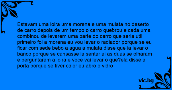 Estavam uma loira uma morena e uma mulata no deserto de carro depois de um tempo o carro quebrou e cada uma combinou de levarem uma parte do carro que seria util primeiro foi a morena eu vou levar o radiador porque se eu ficar com sede bebo a agua a mulata disse que ia levar o banco porque se cansasse ia sentar ai as duas se olharam e perguntaram a loira e voce vai levar o que?ela disse a porta porque se tiver calor eu abro o vidro
