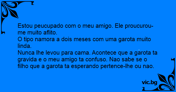 Nunca lhe levou para cama. Acontece que a garota ta gravida e o meu amigo ta confuso. Nao sabe se o filho que a garota ta esperando pertence-lhe ou nao.
