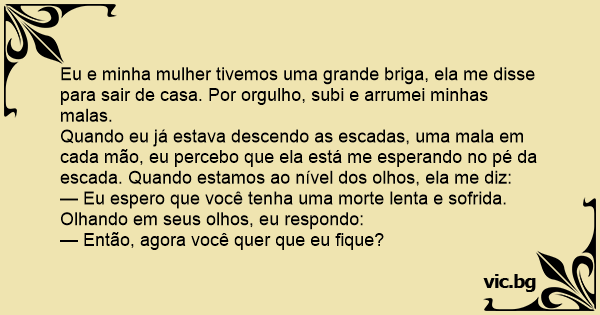Eu e minha mulher tivemos uma grande briga, ela me disse para sair de casa. Por orgulho, subi e arrumei minhas malas.