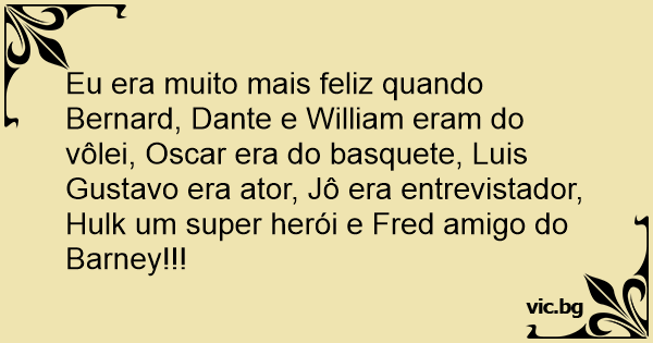 Eu era muito mais feliz quando Bernard, Dante e William eram do vôlei, Oscar era do basquete, Luis Gustavo era ator, Jô era entrevistador, Hulk um super herói e Fred amigo do Barney!!!