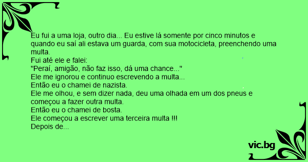 Eu fui a uma loja, outro dia... Eu estive lá somente por cinco minutos e quando eu saí ali estava um guarda, com sua motocicleta, preenchendo uma multa.
