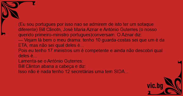 (Eu sou portugues por isso nao se admirem de isto ter um sotaque diferente) Bill Clinotn, José Maria Aznar e António Guterres (o nosso querido primeiro-ministro portugues)conversam. O Aznar diz: