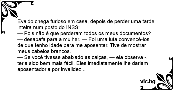 — Pois não é que perderam todos os meus documentos? — desabafa para a mulher. — Foi uma luta convencê-los de que tenho idade para me aposentar. Tive de mostrar meus cabelos brancos.